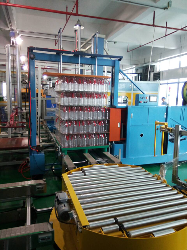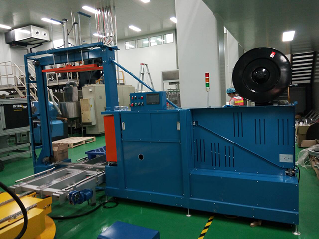 開放式弓架活動的穿帶能將棧板與捆包物牢固地捆包在一起便于移動及運輸,堆滿產(chǎn)品的棧板通過輸送滾筒線可實現(xiàn)無人化捆包生產(chǎn)線。