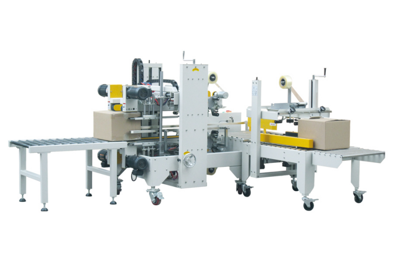 一、單機(jī)使用。這種用法是不太常見的,因?yàn)閲鴥?nèi)使用的紙箱多為上下底折合的這種形式的,但在國外就不盡相同,國外有很多紙箱是在上蓋處開口進(jìn)行取物,因此,只需要對(duì)紙箱的兩邊進(jìn)行粘合就可以了。這種情況下,只需要一臺(tái)角邊封箱機(jī)就可以完成任務(wù)了。