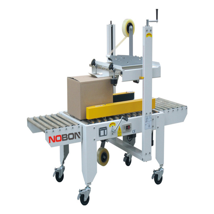 3.打開電源開關(guān),讓機器工作,然后推入紙箱進行封箱。如果發(fā)現(xiàn)上下封箱的膠帶緊松不一,可通過調(diào)整膠帶筒座的旋鈕,使其一致。